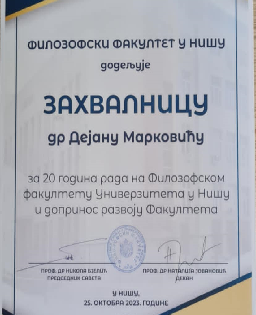 Члан је Наставно-научног и Изборног већа, а у претходном мандату био је и члан Савета Филозофског факултета Универзитета у Нишу. Члан је Већа Центра за образовање наставника и професионално усавршавање (Одлука ННВ Филозофског факултета број 72/1-13-5-01 од 17.02.2016. године)