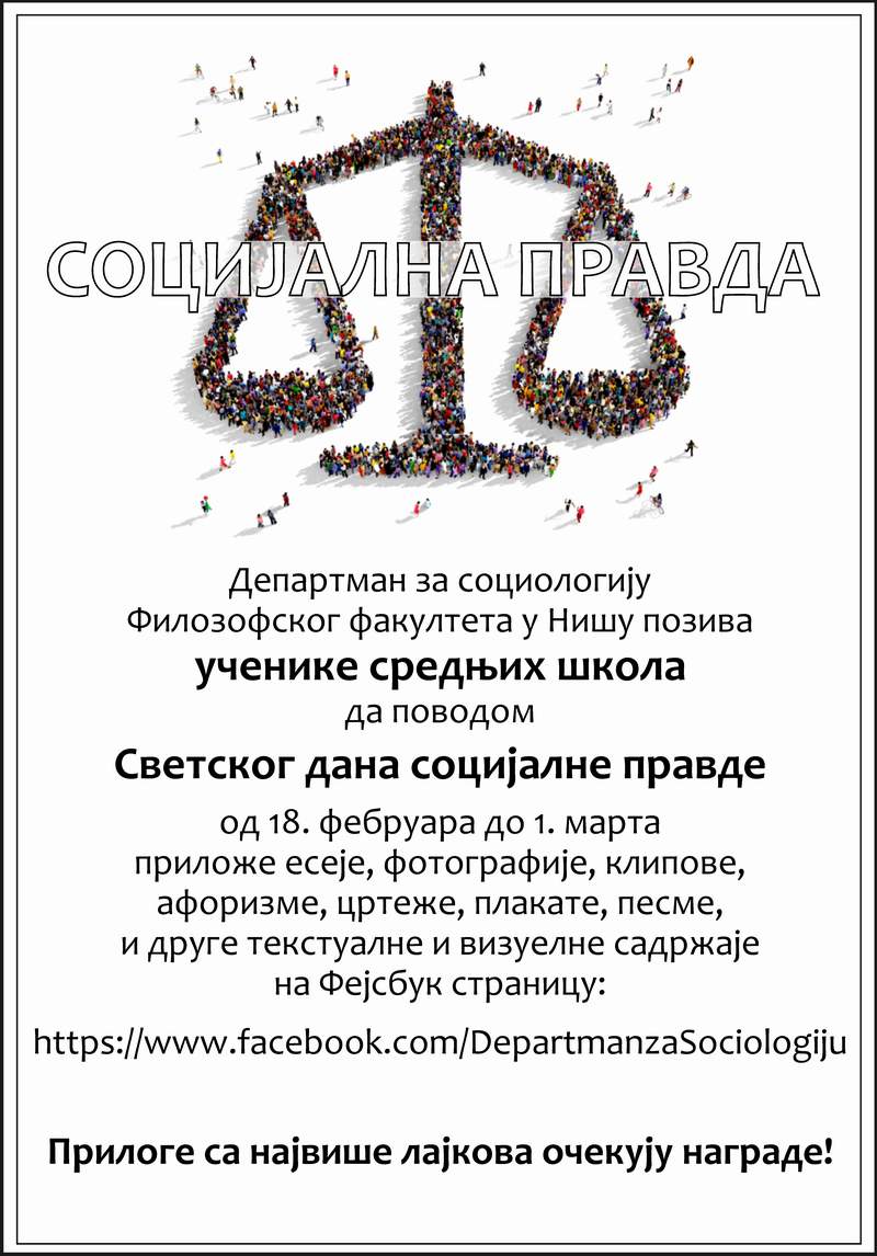 Такмичење ученика средњих школа: Позивамо ученике средњих школа да поводом Светског дана социјалне правде (20. фебруар) од 18. фебруара до 1. марта приложе оригиналне есеје, фотографије, клипове, афоризме, цртеже, плакате, песме и друге текстуалне или визуелне садржаје у коментаре овог поста.