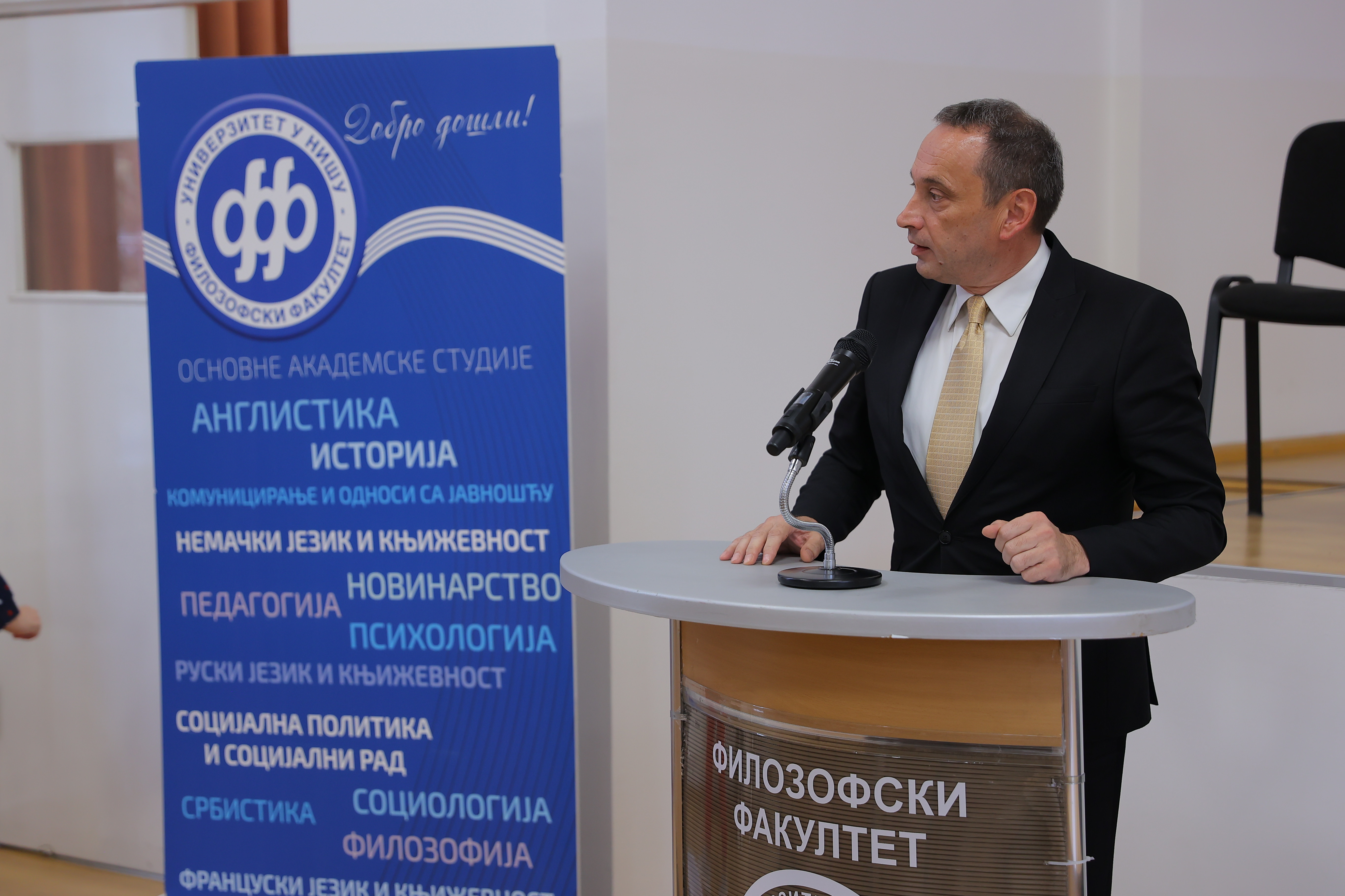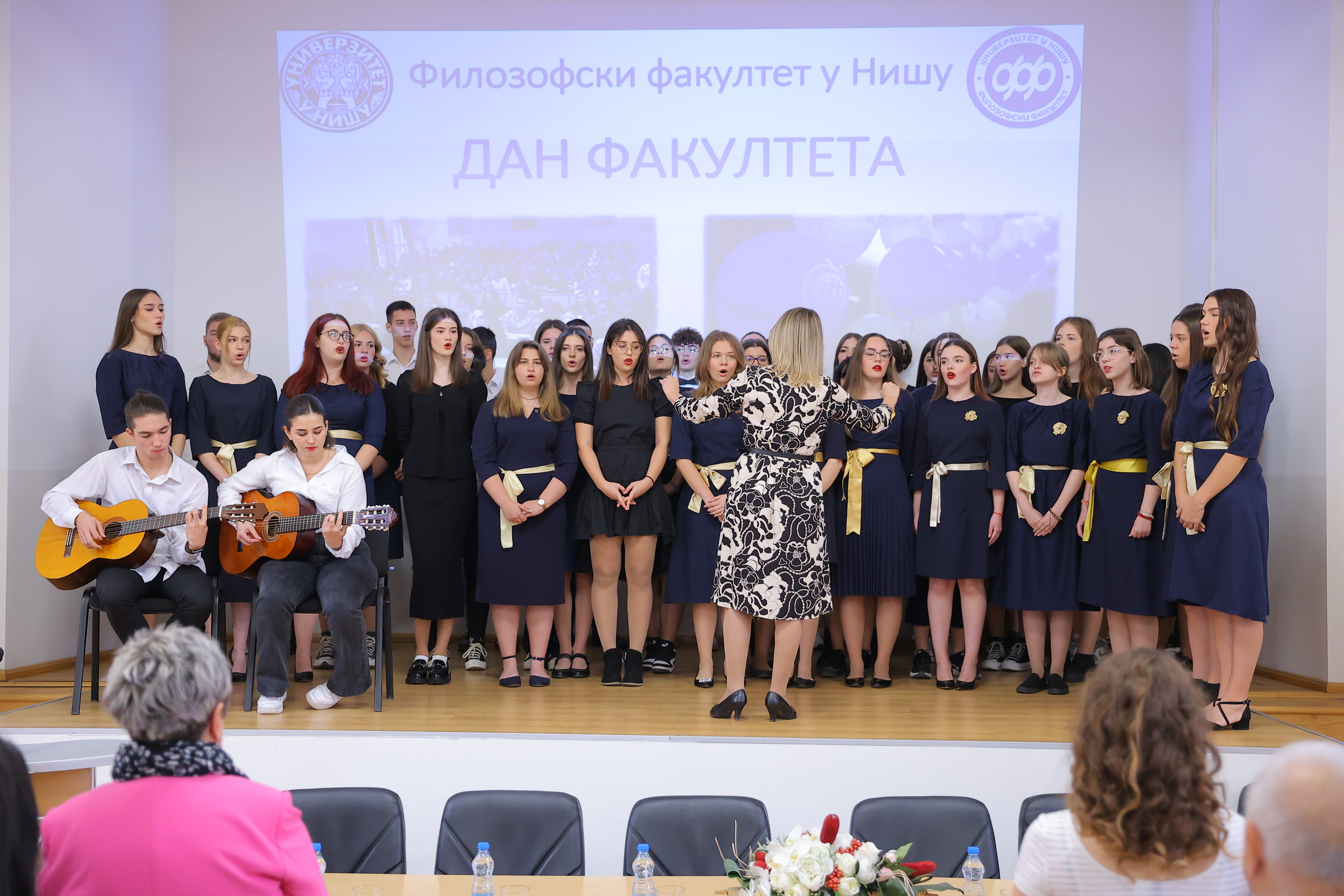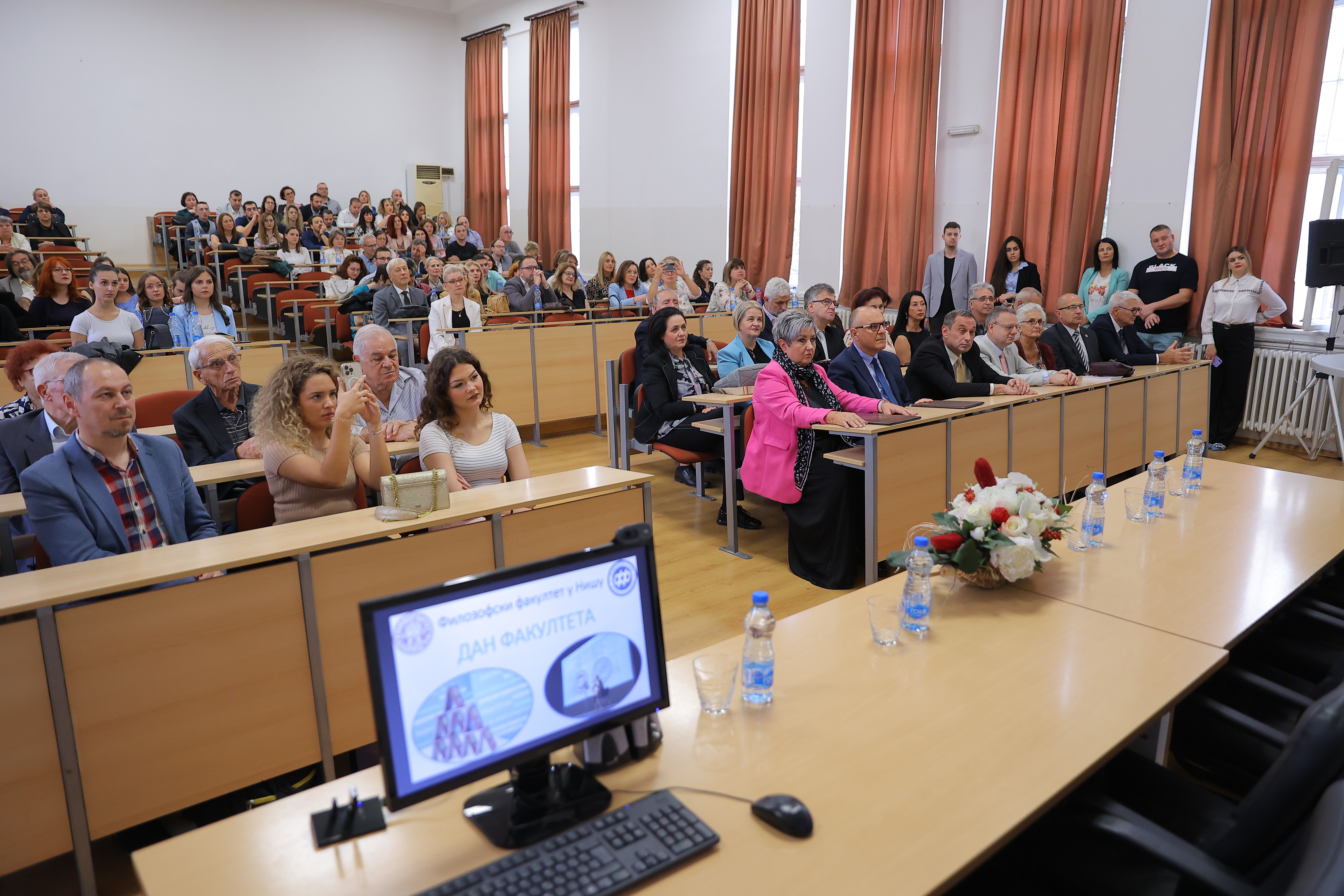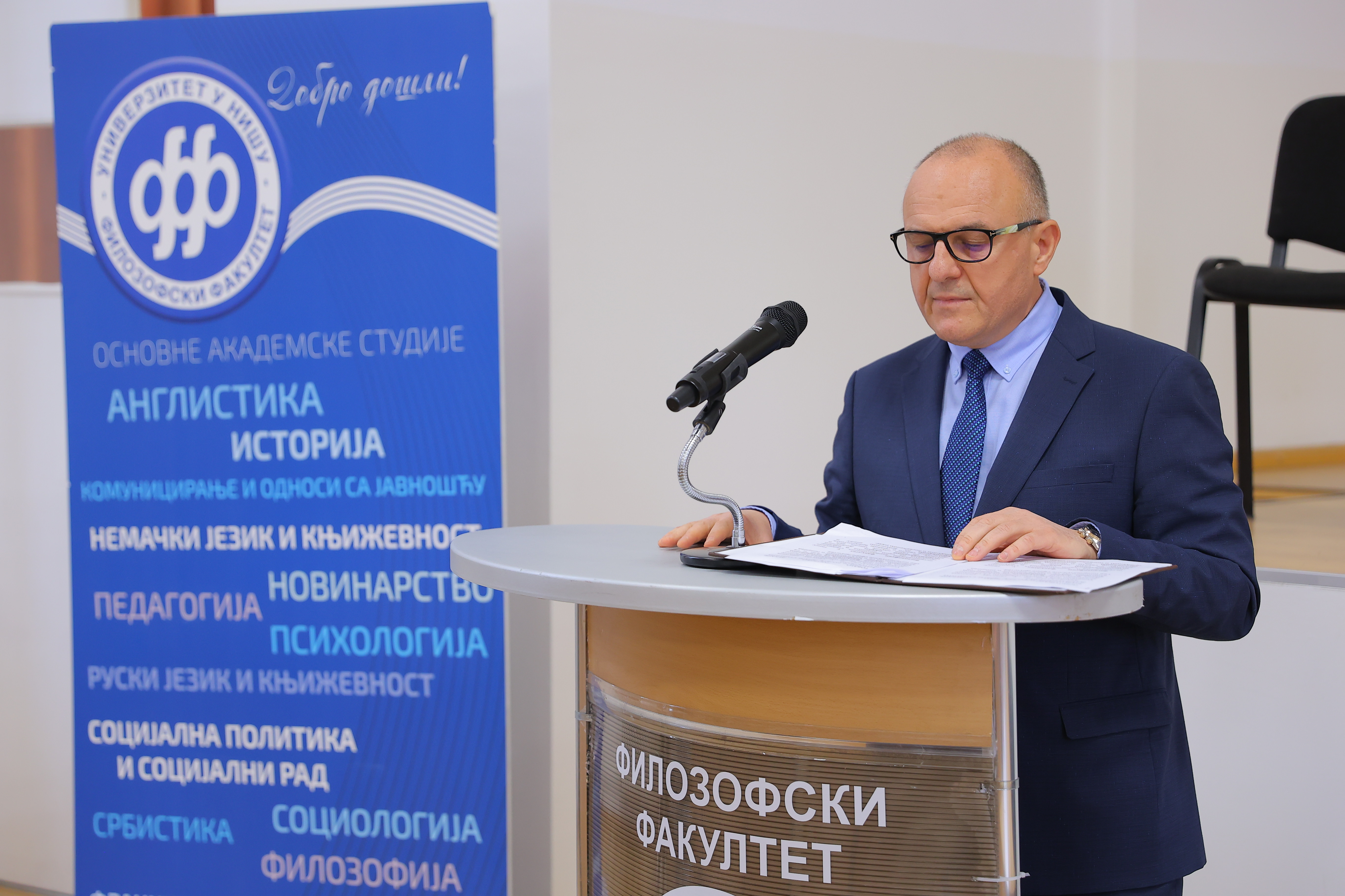 Присутне је прво поздравила декница, проф. др Наталија Јовановић, која је подсетила на значај Филозофског факултета у сфери науке, образовања и културе и додала да се највећи број студената нишког Универзитета већ годинама уназад одлучује за Филозофски факултет. Истакла је да је Факултет универзитет у малом јер нуди највећи број студијских програма на Универзитету у Нишу, као и да студенти нису само број јер им се пружа подршка током студирања и организују бројне активности како би се додатно унапредили.