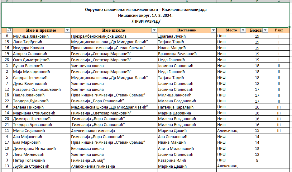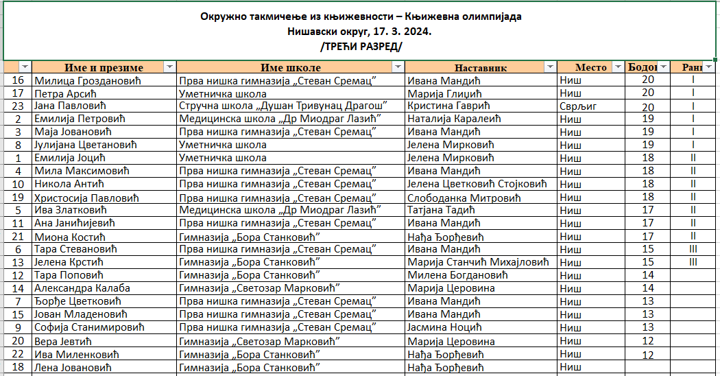 Резултати окружног нивоа Књижевне олимпијаде за средњошколце из Нишавског округа (2024)